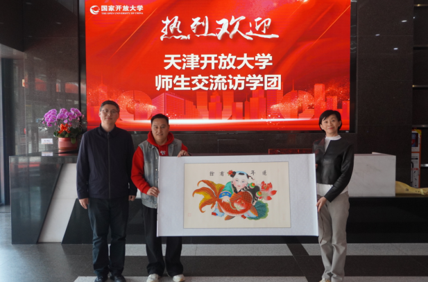 国家开放大学学生工作与教师发展部副部长赵婷婷与研学团带队领导进行了座谈交流。我校优秀学生代表、杨柳青年画传承人王琳杰,向总部赠送了亲手绘制的年画作品。