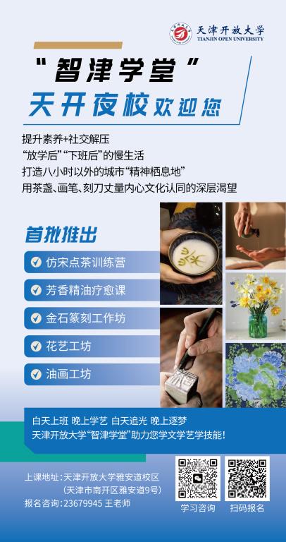 为深入贯彻落实国家关于建设学习型社会、构建服务全民终身学习教育体系的战略部署,学校开设“智津学堂”,恢复夜校教学传统,整合优质教学资源,开设素质提升、生活美学、健身康养相关课程,满足市民多元化、个性化的学习需求。