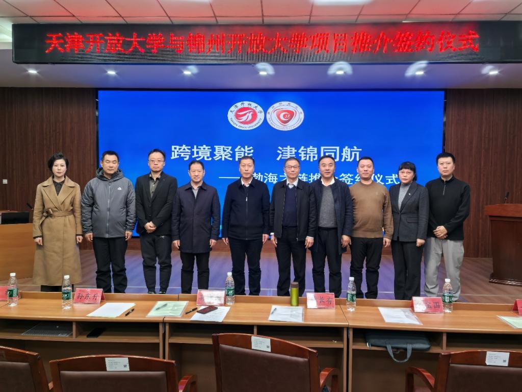12月15日,我校与锦州开放大学“跨境聚能 津锦同航-渤海之链推介签约仪式”在锦州开放大学成功举行。我校党委书记、校长杜长有,锦州市人民政府副市长、中共锦州高新技术产业开发区(松山新区)党工委书记孙志海,锦州开放大学党委副书记、校长孙东升,锦州市教育局副局长任宝国,天津开放大学跨境电商学院负责同志、锦州开放大学各县级分校领导以及全体教职工等120余人参加本次活动。会议由锦州开放大学副校长王荣主持。