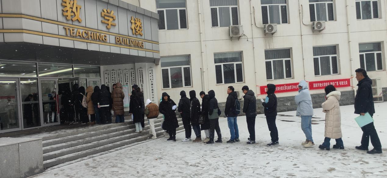 四九时节,凛冽寒风裹挟着风雪席卷津城,天寒地冻、风劲雪急,却挡不住国开学子奔赴考场的坚定脚步。